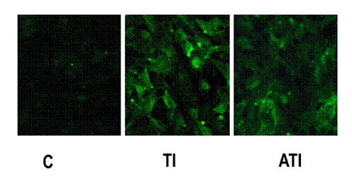Pentru aceasta tehnica s-a folosit acelasi protocol ca si pentru ELISA cu deosebirea ca celulele au fost crescute pe lamele de cultura iar cel ce-al de-al doilea anticorp folosit a fost cuplat cu fluoroforul FITC care are lunginea de unda de excitatie (lex) la 495nm si emisia, lem, la 519nm. Vizualizarea rezultatelor s-a facut la microscopul de fluorescenta (Nikon Microphot-SA).