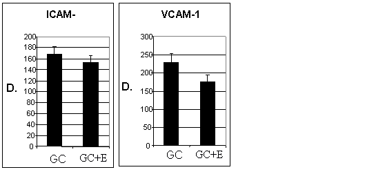 Pentru a elucida efectul enoxaparinei asupra expresiei moleculelor de adeziune celulara, celulele endoteliale (CEV sau EA 926) au fost crescute in conditii normale de glucoza (Control) sau in conditii de glucoza crescuta (GC). La confluenta, celulele crescute in GC au fost expuse in continuare timp de 48 ore la GC in prezenta sau absenta de enoxaparina (16mg/ml). Testele ELISA au aratat ca in urma expunerii CEV sau EA 926 la glucoza crescuta, acestea prezinta o expresie crescuta a moleculelor de adeziune celulara: ICAM-1, VCAM-1 si E-selectina. Dupa cum se observa in figura I.10, in cazul CEV, considerand controlul 100%, cresterea a fost de 168 8% pentru ICAM-1, ~229 10% pentru VCAM-1, si ~162 10% pentru E-Selectina. De asemenea, EA 926 cultivate in conditii crescute de glucoza prezinta cresteri de: 174 8% pentru ICAM-1, 138 10% pentru VCAM-1 si 186 8% pentru E-selectina (figura I.11). Rezultatele arata ca activarea cu glucoza produce cresteri similare ale expresiei de ICAM-1 si E-selectina in ambele tipuri de celule endoteliale, comparativ cu controlul, in timp ce expresia VCAM-1 este mai mare in celulele endoteliale valvulare decat in cele ombilicale. Enoxaparina reduce semnificativ expresia moleculelor de adeziune in ambele tipuri de celule endoteliale. Astfel, expresia ICAM-1 a fost redusa cu 10%, a E-selectinei cu 21% si a VCAM-1 cu 23% in VEC (figura I. 10) iar in cazul EA 926, ICAM-1 cu11%, E-Selectina cu 10% si VCAM-1 cu 10%, (figura I.11)