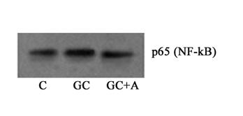 Pentru a studia efectul aspirinei si enoxaparinei asupra factorului de transcriptie NF-kB, CE au fost crescute in DMEM continand : (i) concentratie normala de glucoza, 5mM (control), (ii) concentratie crescuta de glucoza, 33mM (GC) si (iii) GC urmata de tratarea timp de 48 ore cu aspirina (1mM) si enoxaparina (16mg/ml). Dupa incubare, celulele au fost lizate in tampon de liza ce contine : 10mM Hepes pH 7.6, 15mM KCL, 2mM MgCl2, 0.1 mM dithiothreitol-DTT, 1% Triton X 100, 0.5 mM PMSF si 5 mg/ml inhibitor1 (benzamidina, pepstatina, leupeptina). Fractiile nucleara si citosolica au fost separate prin centrifugare (650g, 10 min), iar concentratia de proteina din fiecare fractie determinate prin Amido. Proteina din fractia nucleara (80mg) a fost separate in gel de poliacrilamida 12% si transferata pe membrana de nitroceluloza. A urmat blocare timp de 2 ore in tampon cu 5 % lapte degresat si incubarea peste noapte (4 C) cu primul anticorp (2mg/ml anti-subunitatea p65 a NF-kB). Dupa spalari a urmat incubarea timp de o ora cu al doilea anticorp (diluat 1:10 000, la temperature camerei). Detectia benzilor rezultate s-a facut ce kitul ECL (expunere 5 minute) si apoi prin expunerea membranei la film de raze-X. Filmele au fost analizate cu un system vidoe (Image Master from Pharmacia) iar densitatea optica a benzilor a fost determinate cu softul Total Lab 1.11 de la Pharmacia.