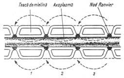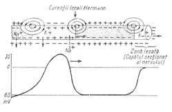 Stimulul sare intervalul dintre cele doua strangulatii, mielina fiind un izolator relativ (fig. 3a). Se activeaza astfel, nodulul lui Ranvier. In axonii amielinici, excitatia este transmisa din aproape in aproape, prin depolarizarea membranei prin curenti locali Hermann (fig. 3b), ceea ce explica viteza mai lenta de raspandire.