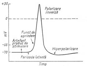 Cand polarizarea somei neuronale este redusa la un nivel critic de 60 mV, apare o depolarizare brusca. Acest nivel critic provoaca un potential de actiune care se propaga dealungul axonului. Potentialul intracelular ajunge astfel, de la -70 mV la +20 mV, fiind deci de 90 mV fata de nivelul initial. Spre deosebire de PPSE, potentialul de actiune se supune legii tot sau nimic, nefiind neproportional cu intensitatea excitatiei.