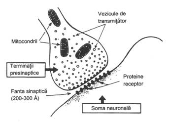 Impulsul nervos este transmis de la un neuron la altul cu ajutorul mediatorilor chimici, dintre care cel mai cunoscut este acetilcolina. Actiunea ei dureaza putin, datorita colinesterazei aflate la acest nivel si care o inactiveaza rapid. Efectul stimularii poate fi prelungit impiedicand actiunea acestei enzime cu ajutorul unor substante farmacodinamice numite anticolinesteraze (ex. ezerina). Alaturi de acetilcolina, ca mediator chimic sinaptic pot interveni si alte subtante ca: acidul glutamic, noradrenalina, serotonina, histamina.