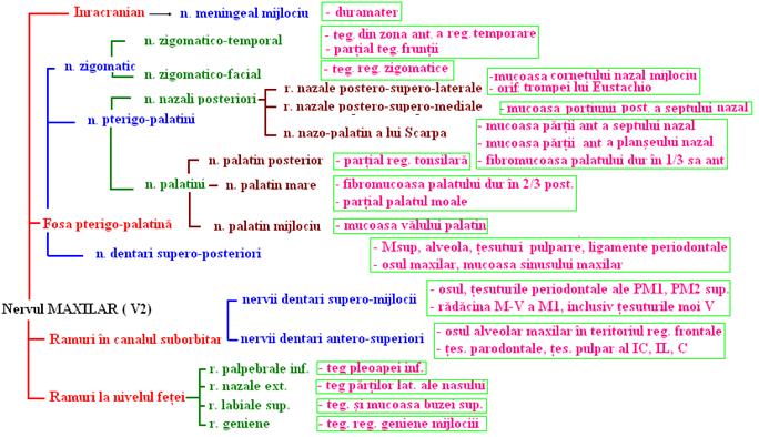 - nervii dentari supero-posteriori, apoi intra in orbita prin fisura orbitara inferioara, intrand intr-un sant, suborbitar, devine nerv suborbitar (infraorbitar), apoi in canalul suborbitar si da colaterale dentare: