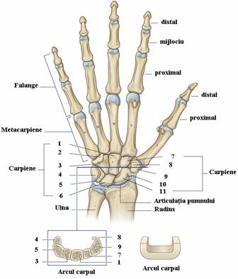 Oasele mici ale carpului participa la formarea articulatiei pumnului si sunt dispuse pe doua randuri: proximal si distal, fiecare rand continand patru oase; astfel, in randul proximal