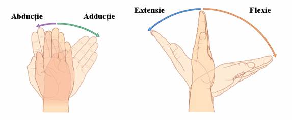 Flexiunea este miscarea prin care palma se apropie de fata anterioara a antebratului , iar extensia este miscarea prin care fata dorsala a mainii se apropie de fata posterioara a antebratului.
