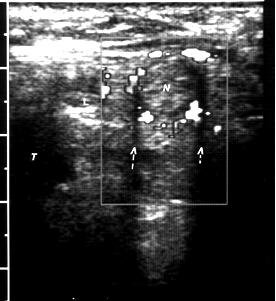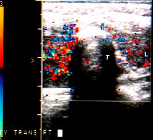 Ecografie tiroidiana : LD 6,1/3/2,6 cm, ecostructura hipoecogena, intens neomogena prin prezenta in 1/3 superioara a unui nodul de 2,1/1,8cm, hipoecogen, intens vascularizat si 1/3 inferioara a unui alt nodul de 1,3/1 cm, hipoecogen, vascularizat; restul lobului cu vascularizatie usor redusa.