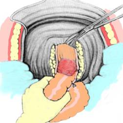 Dupa identificarea si eliberarea sa partiala, se introduce transanal un stapler circular EEA, la care se scoate nicovala si se inlocuieste cu un mandren ascutit (Fig. 4). Operatorul va identifica staplerul si se va asigura ca in fata lui nu exista fund de sac vaginal sau vezica urinara. Se va elibera o suprafata limitata a peretelui rectal, unde bombeaza incarcatorul, se ambaleaza cremalierul staplerului, care va face ca mandrenul sa perforeze bontul rectal. Se ridica mandrenul si, in jurul axului staplerului, exteriorizat in cavitatea peritoneala, se confectioneaza o bursa cu ajutorul unui ac curb.
