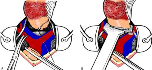 Fig. 3 - Operatia Hartmann. A. eliberarea rectosigmoidului cu ligatura mezorectului; B. aplicarea unui stapler liniar sub jonctiunea rectosigmoidian (1)
