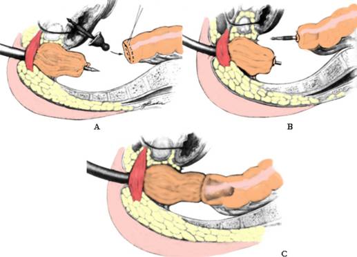 Fig. 4 - Restabilirea continuitatii digestive dupa operatia Hartmann: A. Introducerea staplerului circular curb transanal si perforarea cu mandrenul a bontului rectal; introducerea nicovalei in capatul colic proximal dupa sectiunea colonului razant cu colostomia si efectuarea bursei; B. Strangerea celor doua burse si introducerea axului nicovalei in axul staplerului dupa scoaterea mandrenului; C. Realizarea suturii mecanice circulare (1)
