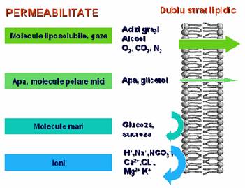 permeabila pentru molecule liposolubile (acizi grasi, etanol) si molecule de gaz (O2 si CO2), care strabat cu usurinta matricea fosfolipidica;