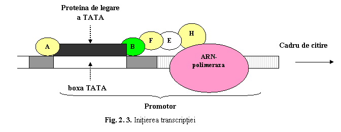 1) Initierea transcriptiei. Deoarece ARN-polimeraza nu poate recunoaste direct promotorul si nu poate initia singura transcriptia, sunt necesari o serie de factori de transcriptie, care se fixeaza in regiunea promotor (fig. 3), dirijand si activand astfel enzima. Transcriptia incepe la nivelul situsului de initiere a transcriptiei.