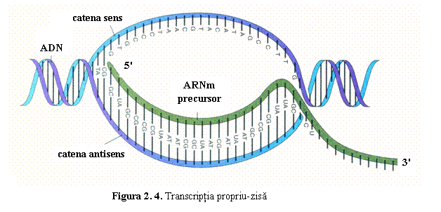 (2) Matrita este reprezentata de o singura catena de ADN. Numai una dintre cele doua catene ale ADN (3'→5') este transcrisa si serveste ca matrita pentru sinteza moleculei complementare si antiparalele de ARNm (5'→3'); catena transcrisa este denumita si catena antisens. Catena ADN netranscrisa, ale carei secvente nucleotidice sunt identice cu cele ale ARNm, este numita si catena sens (fig. 2). Cele doua catene ale ADN se vor separa temporar si pe lungimi scurte, pentru ca una din ele sa serveasca drept matrita pentru ribonucleotidele complementare.