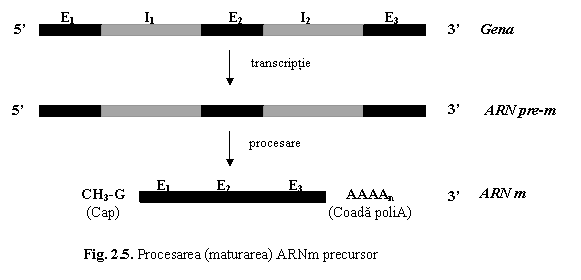 Maturarea ARNm precursor (fig. 5) are loc la nivel nuclear si se realizeaza prin doua procese: (1) insertia de secvente nucleotidice la extremitatile moleculei si (2) matisarea ARN precursor.