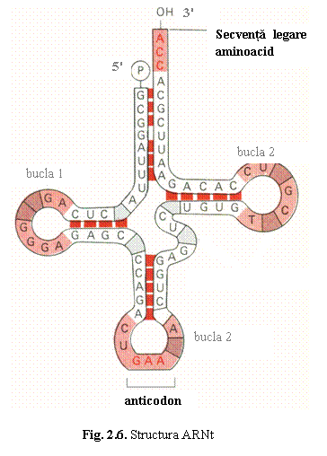 ARNt este un poliribonucleotid cu structura "in trifoi": prezinta trei regiuni scurte, dublu catenare numite tulpini, care se termina cu bucle monocatenare (fig. 6), structura care este identica la toate tipurile de ARNt. ARNt contine doua secvente importante: (1) secventa CCA de la capatul 3'OH de care se leaga aminoacidul cu ajutorul enzimei aminoacil-ARNt-sintetaza; (2) anticodonul, o secventa de trei nucleotide situata in bucla opusa capatului 3'; anticodonul recunoaste, prin complementaritate, codonul din ARNm corespunzator aminoacidului.