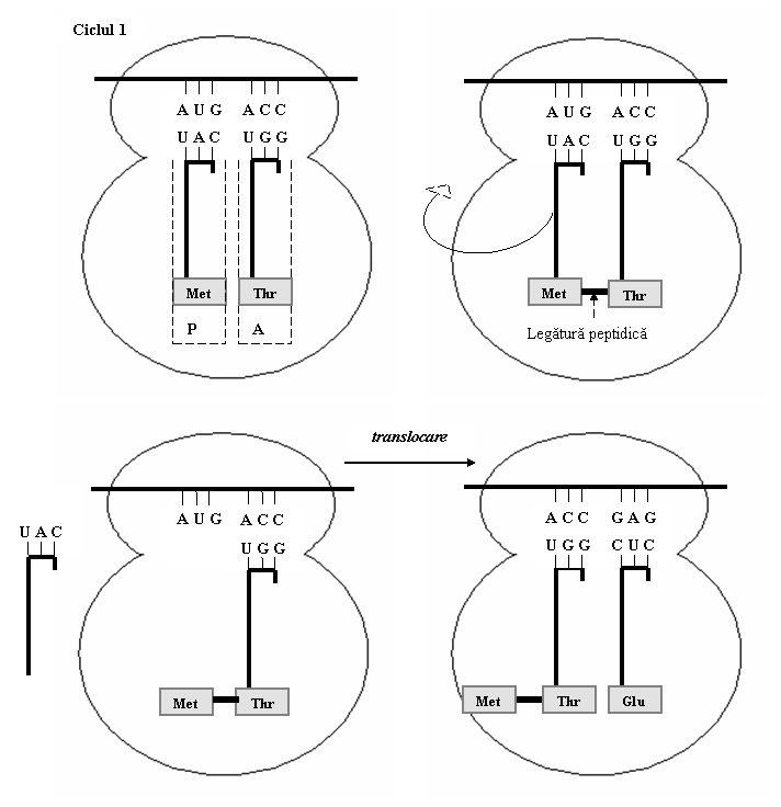 Cele trei faze - atasarea aminoacid-ARNt la ribozom, formarea legaturii peptidice si translocarea ribozomului - se repeta ciclic, determinand cresterea lantului polipeptidic.