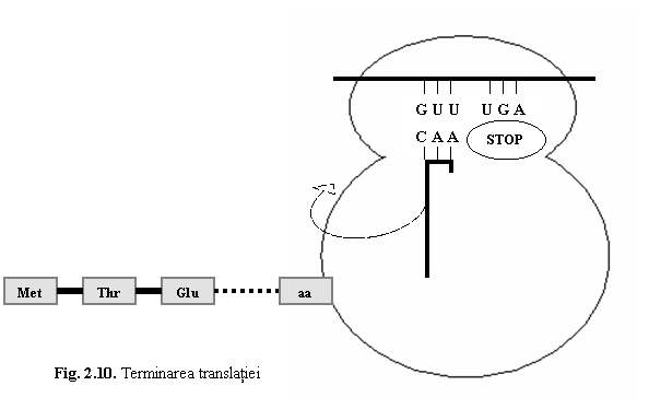 (3) Terminarea traducerii are loc in momentul cand in situsul A ajunge un codon stop (UAA, UAG sau UGA) (fig. 10). Deoarece nu exista un ARNt corespunzator codonilor stop, se leaga o molecula de apa la nivelul peptidului. Polipeptidul eliberat astfel din ribozom va suferi o serie de modificari si va dobandi forma tridimensionala specifica.