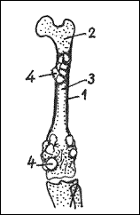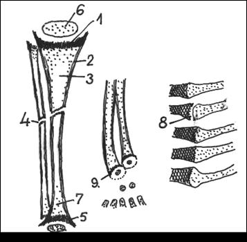 ; 6 - nuclei epifizari, decalcificati ; 7 - spongioasa