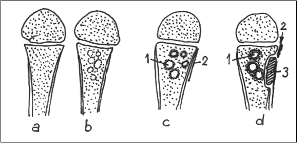 modificarile macrostructurii care apar dupa 3 saptamani sunt expresia tulburarilor circulatorii si se traduc prin combinarea variata a principalelor leziuni elementare osoase radiologice;