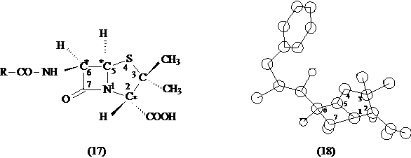 neechivalente, atasate la C3 (endo-, mai dezecranat si exo) si a dispozitiei reciproce a ciclurilor azetidin-2-onic si tiazolidinc, pentru care constanta de cuplaj intre protoni H-5 si H-6 (care se constituie intr-un sistem de tip AB), de aproximativ 4 Hz, pledeaza pentru dispozitia cis a celor doua cicluri. In tabelul 6 sunt redate valorile medii ale deplasarilor chimice ale protonilor situati in pozitia alfa fata de gruparea amidica exociclica, in sarurile solubile ale penicilinelor G si V.