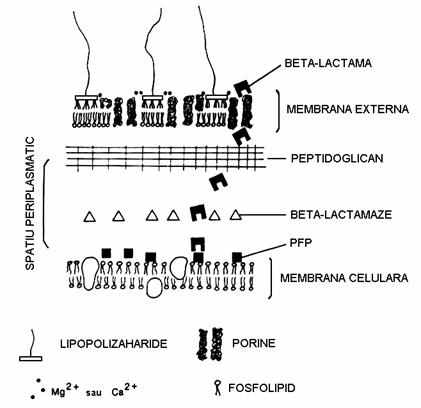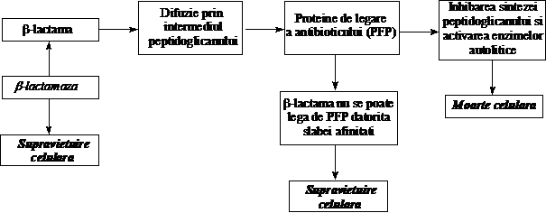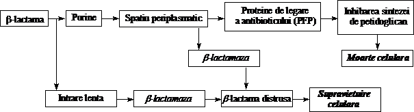 Deschiderea ciclului b-lactamic are loc si la atacului b-lactamazelor, enzime ce se gasesc in spatiul periplasmatic si care sunt capabile de a hidroliza penicilinele (penicilinaze) si cefalosporinele (cefalosporinaze). Aceste enzime sunt strategic plasate, in pasajul urmat obligatoriu de moleculele de antibiotic si reprezinta principalul mecanism de rezistenta a bacteriilor fata de antibiotic.