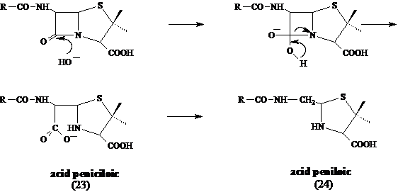 La valori ale pH-ului egale sau mai mari de 8, are loc atacul nucleofil al anionului HO- asupra carbonilului din gruparea lactamica, cu deschiderea ciclului si formarea, in general, in etapa finala, a acidului peniciloic (23).