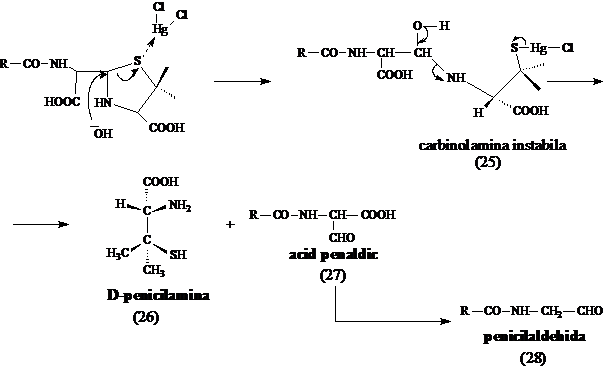 Prezenta in mediu a sarurilor metalice (Zn2+, Cd2+, Pb2+) sau a HgCl2, favorizeaza degradarea acidului peniciloic la o carbinolamina instabila (25) care se descompune in D-penicilamina (26) si acid penaldic (27), acesta din urma decarboxilandu-se la penicilaldehida (aldehida penilica), (28).