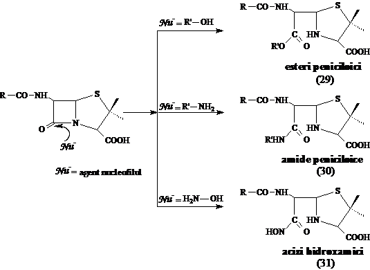 Atunci cand nucleofilul este anionul alcoxid, se formeaza esteri peniciloici (penicilinoici) (29) iar cind nucleofilii sunt amine sau hidroxilamina, se formeaza amide peniciloice (penicilinoice) (30), respectiv acizi hidroxamici (31).