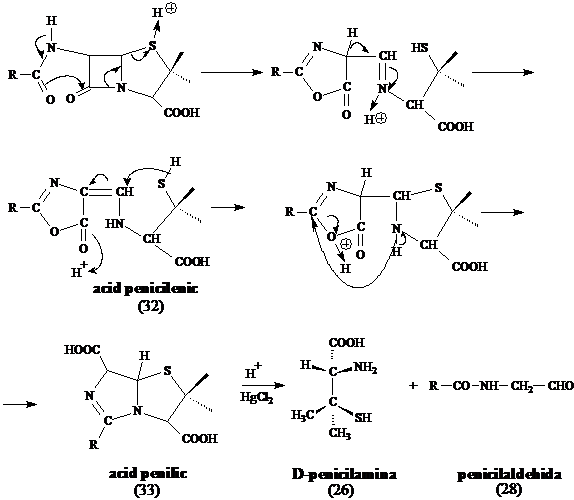 Sub actiunea electrofila a cationului H+ asupra atomului de sulf din ciclul tiazolidin beta-lactamic, are loc deschiderea ciclurilor tiazolidinc si lactamic, printr-un mecanism concertat. Prin rearanjari ulterioare se obtine acidul penicilenic (32) iar daca mediul este puternic acid se poate