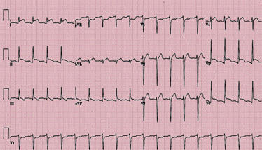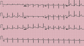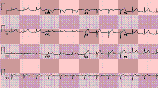 segment ST supradenivelat, cu concavitatea in sus, in aproape toate derivatiile (cu exceptia aVR si V1-V3); raport de amplitudine ST/T in V6 > 0,24; si cu pattern de tip 'concordant' in I-III (spre deosebire de IMA); segment PR subdenivelat in II, III, aVL, aVF si supradenivelat in aVR;