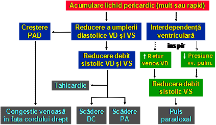 o reducere dramatica a umplerii ventriculare in diastola (pana la colaps al cavitatilor drepte), cu scaderea consecutiva a debitului sistolic VD si VS;