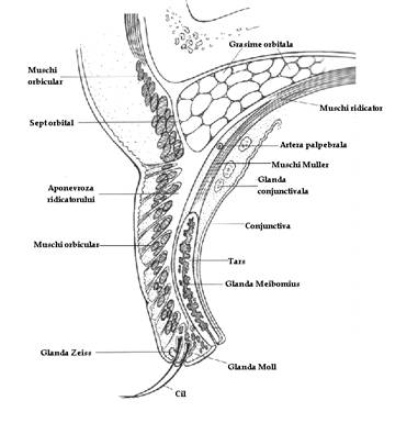 o buza anterioara, pe care se implanteaza cilii (genele) prevazuti cu glande sebacee (Zeiss) si glande sudoripare (Moll);