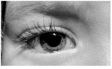 Colobomul palpebral. Reprezinta o lipsa de substanta de forma triunghiulara situata la nivelul marginii libere, care cuprinde uneori toata grosimea pleoapei (colobom total - Fig. 7.3) sau mai rar este absent numai tarsul (colobom partial). Colobomul expune permanent corneea la microtraumatismele externe si este de obicei asociat cu anomalii faciale si ale aparatului lacrimal.