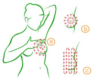 Pentru palpare foloseste varfurile degetelor, tinand degetele intinse. Nu trebuie sa apesi prea tare dar presiunea trebuie sa fie totusi suficient de puternica pentru a simti zonele profunde. Pentru a fi sigura ca nu iti va scapa ceva neobservat miscarile trebuie sa fie cat mai diverse: in cercuri concentrice (a), radiale (b), si de sus in jos (c). Repeta miscarile si pentru celalalt san. Ai grija, la palpare nu vei intalni aceeasi constitutie la ambii sani, nu te astepta sa-i gasesti "gemeni". Pentru a usura alunecarea degetelor pe pielea sanului poti folosi o crema obisnuita pentru piele.