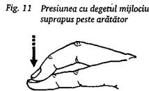 Pentru a asigura stabilitatea, apasati varful degetului mijlociu peste unghia aratatorului. Celelalte degete raman lipite. Presiunea este aplicata cu varful aratatorului (fig. 11). Se utilizeaza in tratamentul fetei si al partilor laterale ale nasului.