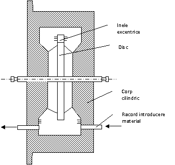 Mod de functionare: discul se roteste cu viteza foarte mare, el are pe partile laterale inele concentrice care se rotesc intre sicane, fixate pe peretii carcasei.Materialul de macinat e introdus sub forma de suspensie lichida prin racord. Viteza discului trebuie sa fie foarte mare pentru a realiza socuri foarte mari, comparative cu lovituri de ciocan.
