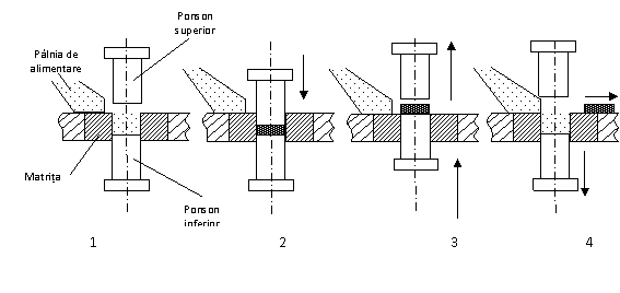 Faza nr. 1 - ponsonul superior si inferior cat si palnia de umplere se gasesc in pozitie initiala-spatiul matritei este umplut cu material de comprimat.