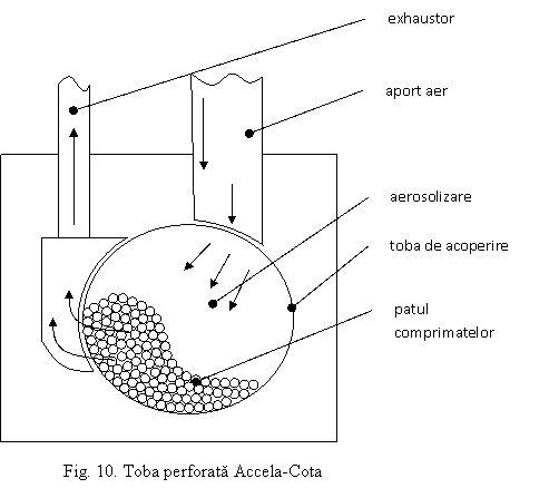 Sistemul cu toba perforata se va folosi. Prin o duza de sprayiere se acopera comprimatul cu film, iar curentii de aer usuca (Fig.10).
