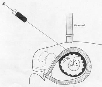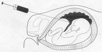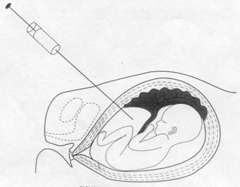 Se face prin aspirarea cu un ac foarte fin a lichidului amniotic prin punctie transabdominala, cultura celulelor din lichidul recoltat si analiza lichidului amniotic pentru anumiti markeri fetali (ca de exemplu: a-fetoptoteina). Proba se face sub ghidaj de ultrasunet, de obicei intre saptamana 15 - 17 de sarcina. Sunt aspirati aproximativ 15-20 ml de lichid amniotic, iar rezultatele testului pot fi comunicate dupa 2-4 saptamani (in functie de metoda de cultura folosita). Fig. 19.