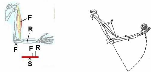 contractia de cativa cm a bicepsului determinand o deplasare liniara de 8 ori mai mare a
