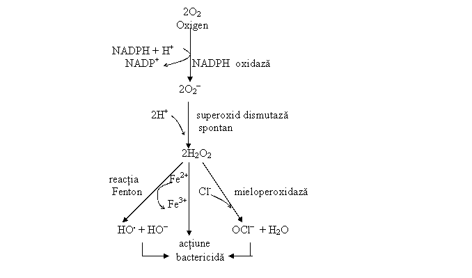 b. sistemul NADPH-oxidazei, enzima cheie a fagocitozei in neutrofilele activate. Activarea ei are loc in urma interactiunii diferitilor liganzi (fragmentul C5a al complementului, peptide chemotactice, etc.) cu receptorii de pe membrana plasmatica. In urma rectiei catalizate de aceasta enzima rezulta anion superoxid (O2-). Anionul superoxid format se transforma in H2O2 spontan sau prin reactia catalizata de superoxid dismutaza. H2O2 fie parcurge reactia Fenton si formeaza un anion si un radical hidroxil sau reactioneaza cu Cl- in reactia catalizata de mieloperoxidaza si formeaza hipoclorit (OCl-). In ambele cazuri se formeaza compusi cu actiune bactericida.