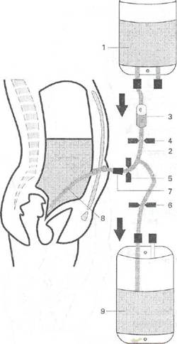 1-recipient (punga) continand solutie dializanta; 2-tubu!atura de conectare (setul de transfer); 3-picurator; 4, 5, 6-cleme; 7-piesa intermediara de legatura cu cateterul peritoneal; 8-cateterul peritoneal; 9-recipient (punga) pentru dializantul efluent - adaptata dupa N Ursea - Rinichiul artificial, 1997 [9]