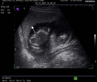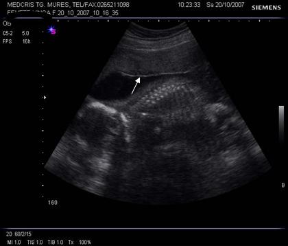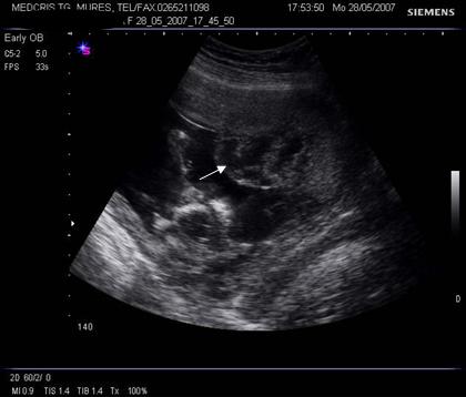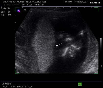 Fig. nr.212. Spatiu chistic subchorionic , la o sarcina de 12 saptamani. ( sageata ), placenta inserata pe peretele anterior uterin