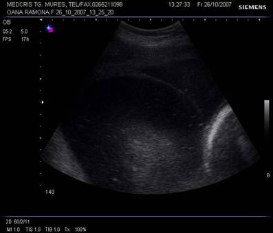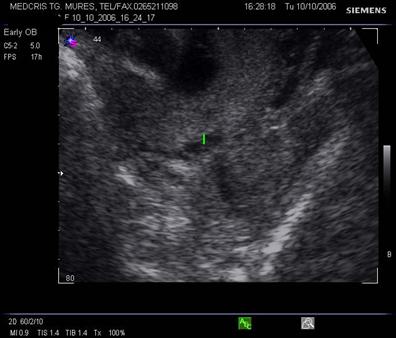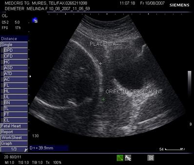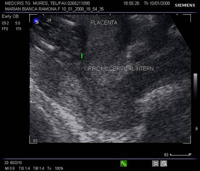 Fig. nr.217. Placenta praevia centrala la 15 saptamani ( linia indica raportul placenta praevia cu orificiul cervical intern)