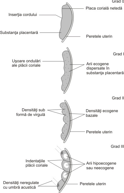 Fig. nr. 207. Gradele de maturatie placentara , prezentate schematic( adaptat dupa Grannum[4])