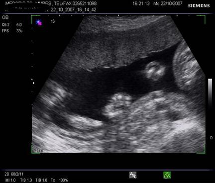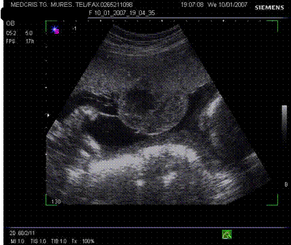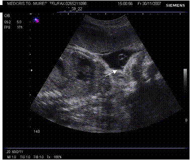 Fig. nr.205. Placenta fundica si posterioara ( normal inserata, cu sageata ) la o sarcina de 16 sapt.
