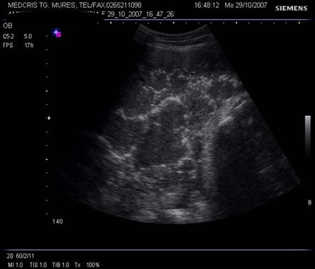 Fig. nr.211. Placenta grad. III la 41 saptamani gestationale, se remarca in structura placentara hiperecogenitati concentrice, in jurul unor zone relativ anecogene
