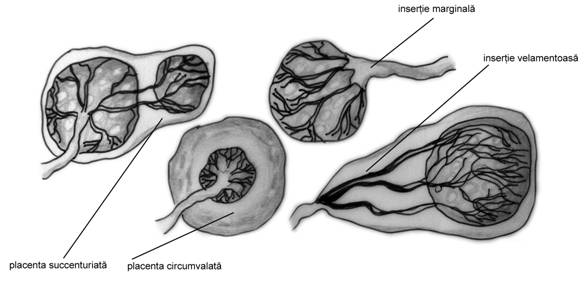 insertia velamentoasa (circa 1%) - factorii de risc sunt multiparitatea, anomalii uterine, sarcina si dispozitivul intrauterin. Ruptura prematura de membrane poate produce alterari ale vaselor velamentose si sangerare cu moarte fetala in utero.