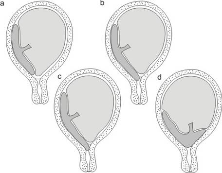 Fig. nr.216 Schema localizarii placentare, a. placenta jos inserata, b.placenta praevia marginala, c. placenta praevia partial centrala,