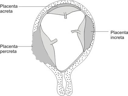placenta acreta: vili aderenti de miometru fara interpunere de strat decidual, la o parte sau la intreaga placenta.