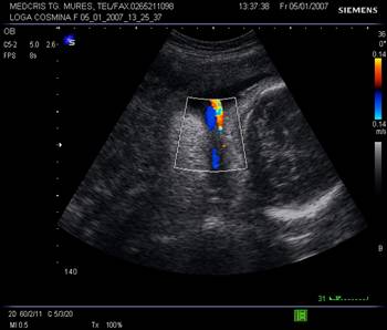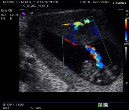 Fig. nr. 228. Circulara de cordon in jurul gitului , la o sarcina de 30 sapt., demonstrata la Doppler color